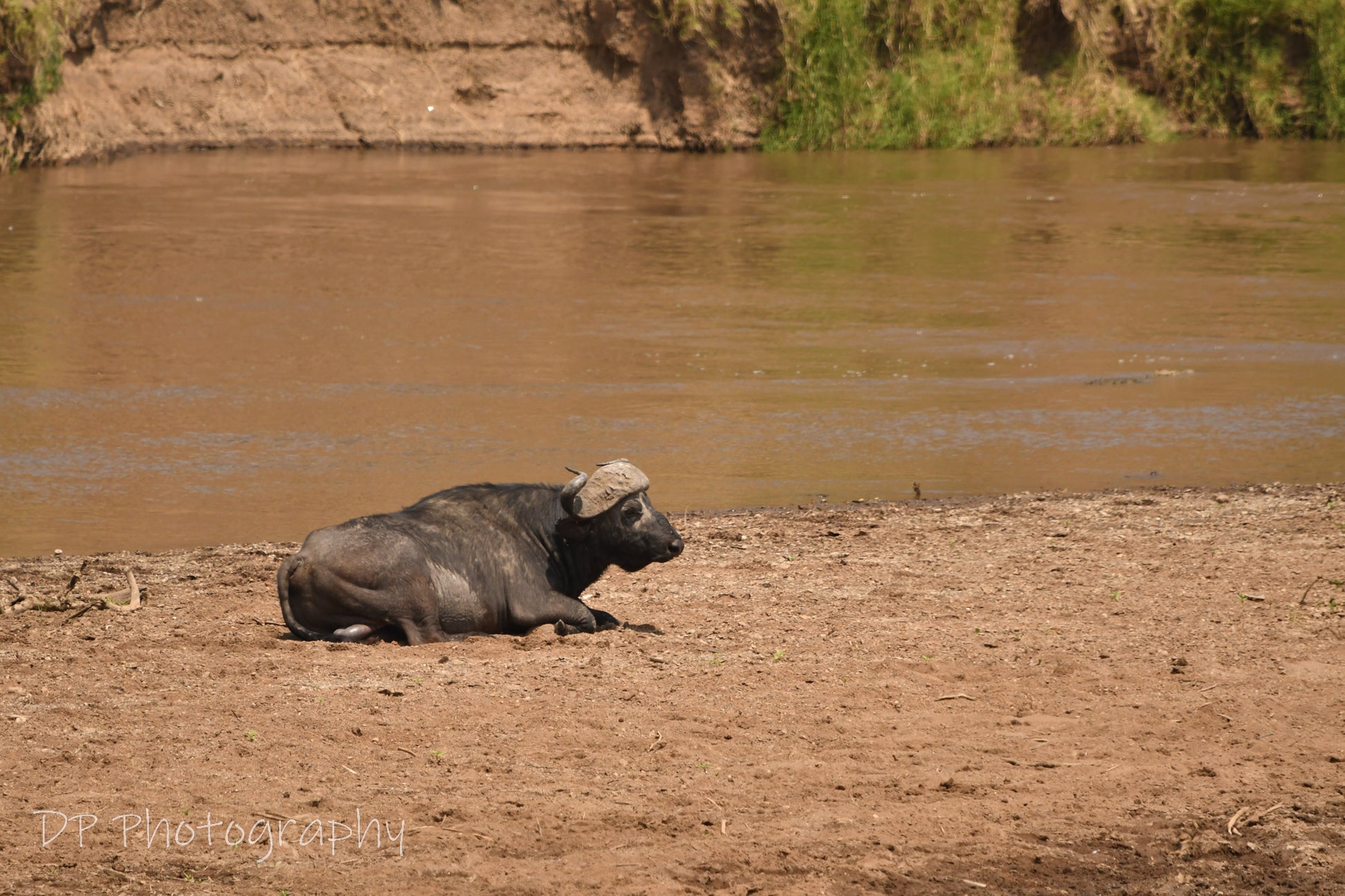 An old and lonely bull buffalo sits by the Mara river. Do animals think on the past? Most say not. But this is a thought provoking scene?