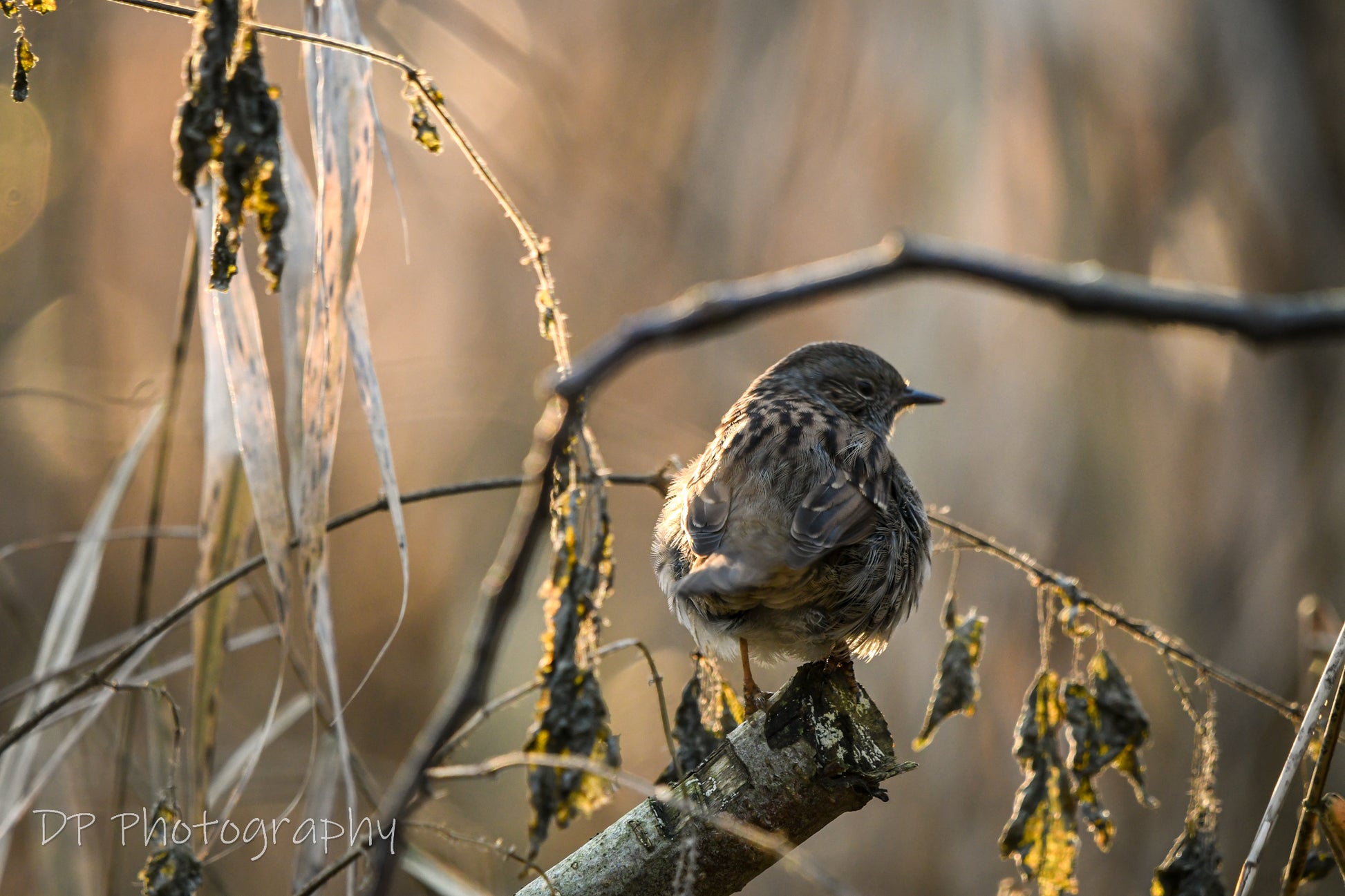 A Hedge sparrow otherwise known as a 'Dunnock', sitting on a branch watching enviously at the other birds scoop up all the good grub